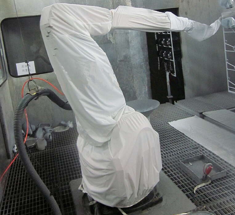 噴涂機(jī)器人代替人力操作,可提高噴涂質(zhì)量和材料的使用率,但是長期操作噴涂材料中的各類化學(xué)成份也將侵害機(jī)器人的手臂。特別是油漆泵,噴涂機(jī)器人在工作過程中,機(jī)器人本體不可避免地處于油漆噴霧易爆環(huán)境中,安裝噴涂機(jī)器人防護(hù)服使機(jī)器人隔離靜電、粉塵、易燃物的措施異常重要。