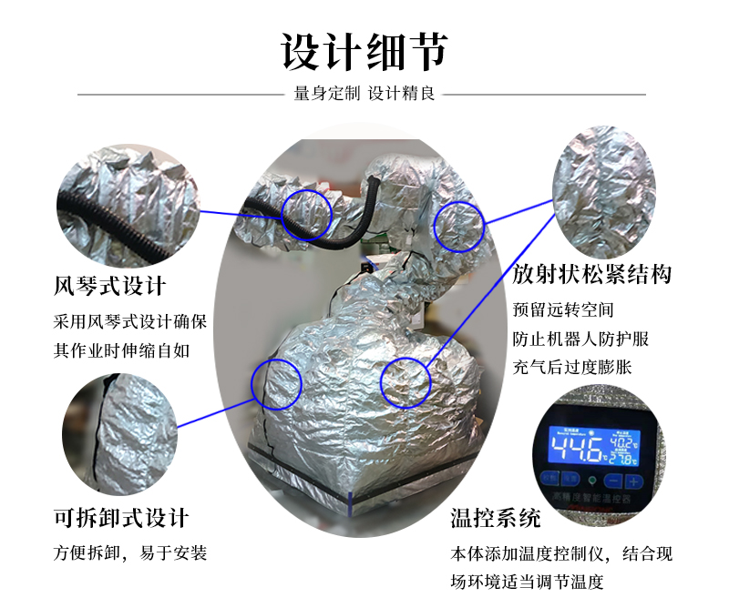 熱吹風(fēng)機(jī)器人保溫防護(hù)服是采用多層材料制作而成,具有耐高低溫、阻燃防火、保溫隔熱等功能,具備自動(dòng)恒溫功能,機(jī)器人防護(hù)服內(nèi)部自帶探頭可檢測(cè)內(nèi)部溫度,根據(jù)現(xiàn)場(chǎng)需求,自由調(diào)節(jié)熱吹風(fēng)機(jī)吹風(fēng)口溫度,使其保存恒定溫度,保證機(jī)器人在室溫-40°的環(huán)境下正常運(yùn)行。