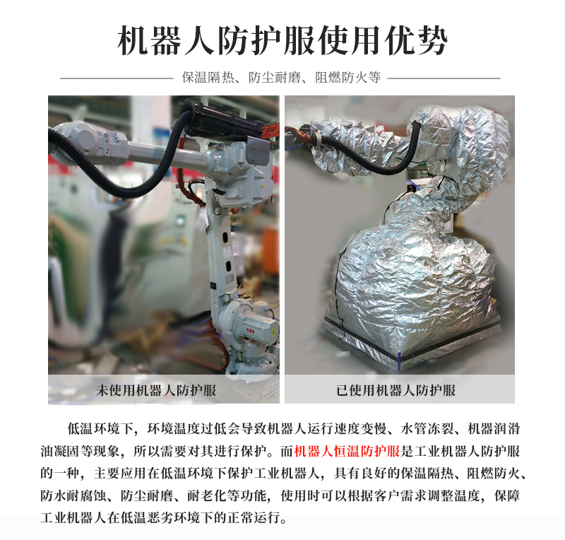 實(shí)驗(yàn)室低溫環(huán)境下,工業(yè)機(jī)器人在作業(yè)時(shí)很容易受環(huán)境影響,比如潤(rùn)滑油被凝固、水管凍裂、電機(jī)啟動(dòng)速度緩慢等,更甚至是降低機(jī)器人運(yùn)行速度,從而影響機(jī)器人的正常運(yùn)行。我司針對(duì)客戶實(shí)際需求,研發(fā)制作出一款熱吹風(fēng)機(jī)器人保溫防護(hù)服,結(jié)合現(xiàn)場(chǎng)實(shí)際需求,可以有效保障機(jī)器人在低溫惡劣環(huán)境下正常使用。